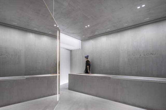 今天廣州裝飾公司為你分享這個第一眼沒認出是美發店的案例,據說這個項目的要求非常多,不能有任何的固定隔墻,所有空間中可見的墻體,必須是可以移動的,像吧臺鏡子和各種柜子都得是能移動的,這個地方并不大,要滿足理發店的所有功能需求,這不容易,何況還要很有設計感。室內的設計以塊面的穿插,鏡面的反射來趣味整個空間,非常高級且有藝術感的灰色形成多個平面交替,最后用一抹藍色來打破它。
